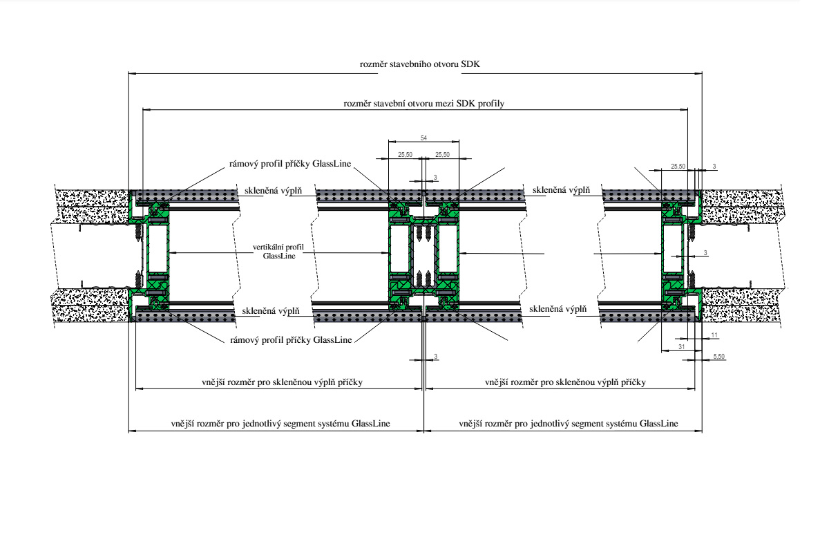 Prosklené hliníkové příčky ze systému GlassLine 2.0 nabízí jedinečný design v podobě skleněné příčky bez rušivých elementů. Po instalaci příčky jsou skla v jedné rovině se stěnou a Vás již nebudou rušit vyčnívající části profilů. Základní rám systému GlassLine 2.0 se instaluje do stavebních otvorů bez skla. Po dokončení stavebních a dokončovacích prací se osadí skleněné panely a celý systém se utěsní.